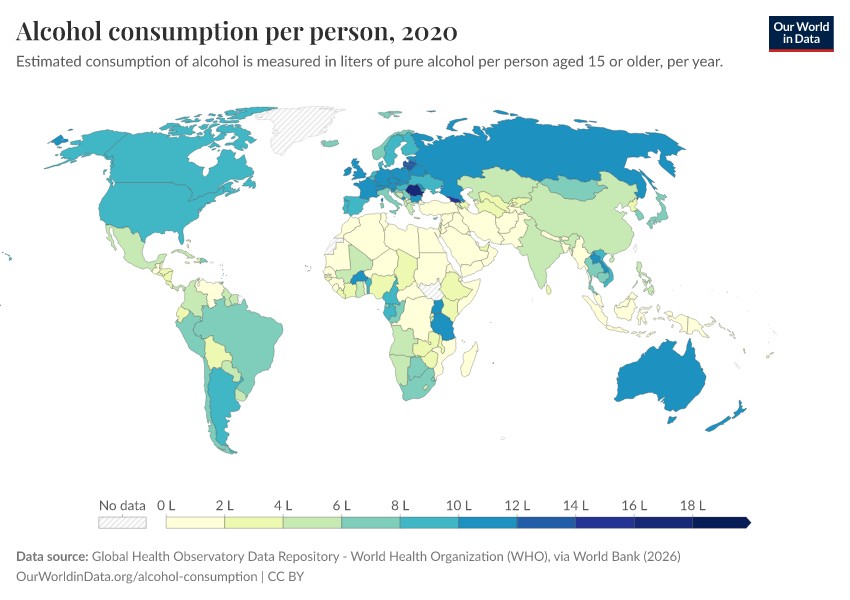 Hannah Ritchie and Max Roser (2022) - “Alcohol Consumption” Published online at OurWorldinData.org. Retrieved from: 'https://edit-mdim.owid.pages.dev/alcohol-consumption' [Online Resource]BibTeX citation