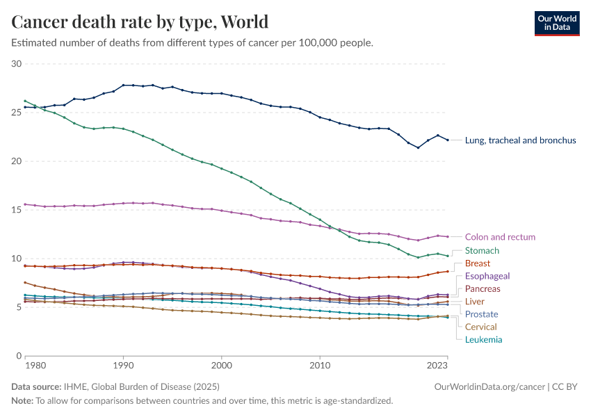 Saloni Dattani, Veronika Samborska, Hannah Ritchie, and Max Roser (2024) - “Cancer” Published online at OurWorldinData.org. Retrieved from: 'https://edit-mdim.owid.pages.dev/cancer' [Online Resource]BibTeX citation