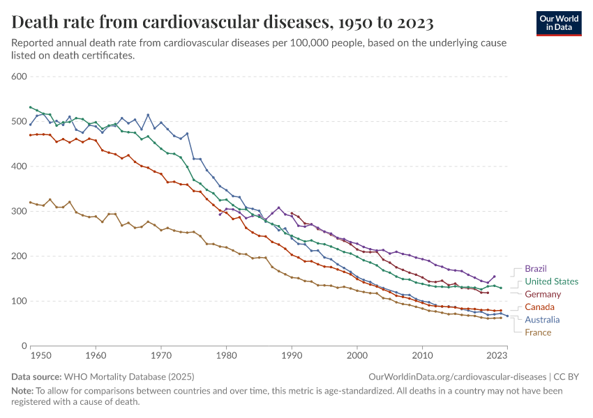 Saloni Dattani (2025) - “Death rates from cardiovascular disease have fallen dramatically — what were the breakthroughs behind this?” Published online at OurWorldinData.org. Retrieved from: 'https://edit-mdim.owid.pages.dev:8789/20260119-084543/cardiovascular-deaths-decline.html' [Online Resource] (archived on January 19, 2026).BibTeX citation