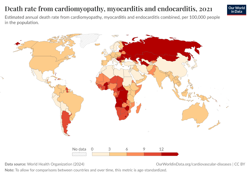 The map shows the estimated death rate from these conditions combined. You can see that death rates tend to be higher in Russia, Eastern Europe, and Southern Africa.