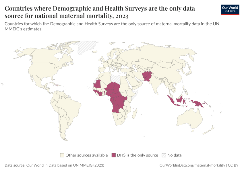 The DHS program was, for example, the only underlying source on maternal mortality for 24 countries in the United Nations’ global estimates of maternal mortality. These countries are shown in the map below.4