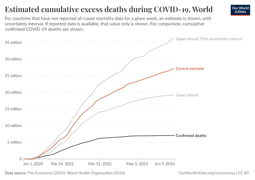 This estimate is especially uncertain in countries without mortality reporting. Globally, the margin of error is around ten million deaths in either direction. But even the most conservative estimates suggest the true toll was at least three times higher than the confirmed count.
