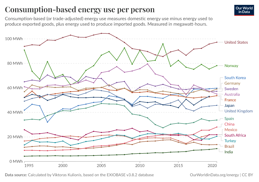 This is measured as the average energy use per year. I’ve calculated this by taking the total consumption-based energy use for each country and dividing by the total population. Population data comes from the UN World Population Prospects.