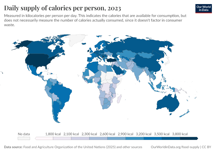 Max Roser, Hannah Ritchie, and Pablo Rosado (2013) - “Food Supply” Published online at OurWorldinData.org. Retrieved from: 'https://edit-mdim.owid.pages.dev/food-supply' [Online Resource]BibTeX citation