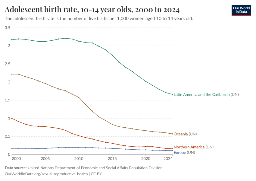 “Data Page: Adolescent birth rate, 10-14 year olds”. Our World in Data (2026). Data adapted from United Nations Department of Economic and Social Affairs Population Division. Retrieved from https://edit-mdim.owid.pages.dev:8789/20260130-180113/grapher/adolescent-fertility.html [online resource] (archived on January 30, 2026).How to cite this data