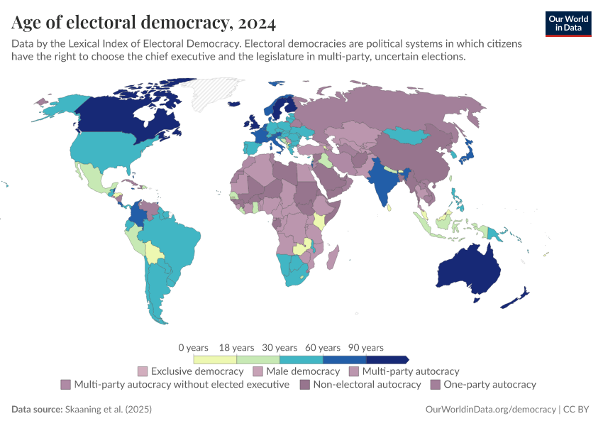 Skaaning et al. (2025) – processed by Our World in Data. “Age of electoral democracy” [dataset]. Skaaning et al., “Lexical Index of Electoral Democracy (LIED) v6.8” [original data]. Retrieved February 24, 2026 from https://edit-mdim.owid.pages.dev:8789/20260119-065148/grapher/age-of-electoral-democracy-lexical.html (archived on January 19, 2026).