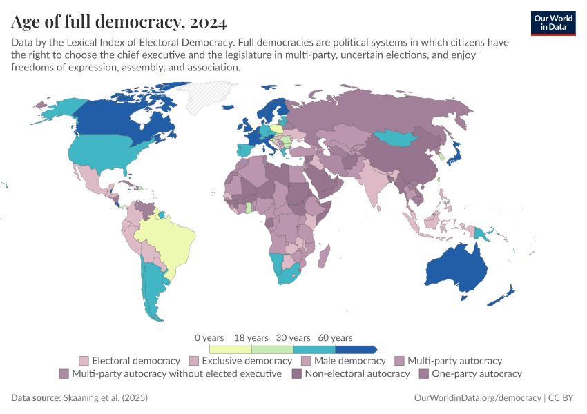 Skaaning et al. (2025) – processed by Our World in Data. “Age of full democracy” [dataset]. Skaaning et al., “Lexical Index of Electoral Democracy (LIED) v6.8” [original data]. Retrieved February 24, 2026 from https://edit-mdim.owid.pages.dev:8789/20260119-065148/grapher/age-of-full-democracy.html (archived on January 19, 2026).