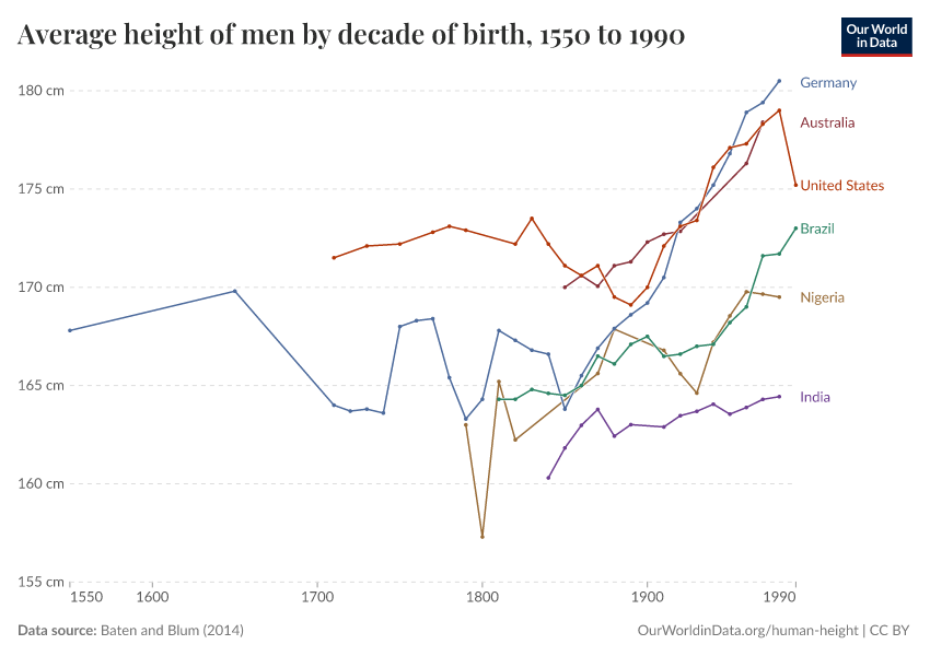 Baten and Blum (2014) – with minor processing by Our World in Data. “Average height of men by decade of birth” [dataset]. Baten and Blum, “Height” [original data]. Retrieved February 24, 2026 from https://edit-mdim.owid.pages.dev:8789/20250909-093708/grapher/average-height-of-men-for-selected-countries.html (archived on September 9, 2025).