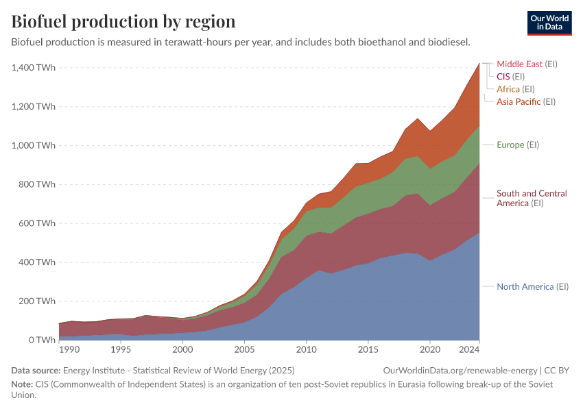 Energy Institute - Statistical Review of World Energy (2025) – with major processing by Our World in Data. “Biofuels production” [dataset]. Energy Institute, “Statistical Review of World Energy” [original data]. Retrieved February 24, 2026 from https://edit-mdim.owid.pages.dev:8789/20260119-065148/grapher/biofuels-production-by-region.html (archived on January 19, 2026).