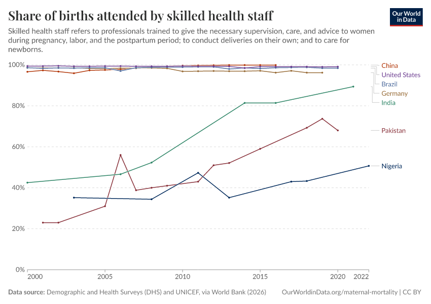 “Data Page: Share of births attended by skilled health staff”. Our World in Data (2026). Data adapted from Demographic and Health Surveys (DHS) and UNICEF, via World Bank. Retrieved from https://edit-mdim.owid.pages.dev:8789/20260202-181317/grapher/births-attended-by-health-staff-sdgs.html [online resource] (archived on February 2, 2026).How to cite this data