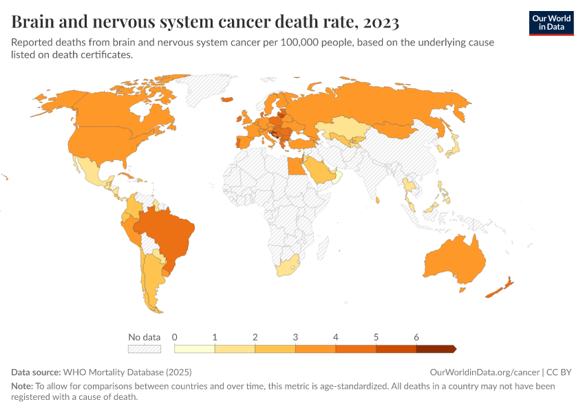 WHO Mortality Database (2025) – with minor processing by Our World in Data. “Brain and nervous system cancer death rate” [dataset]. WHO Mortality Database, “WHO Mortality Database” [original data]. Retrieved February 24, 2026 from https://edit-mdim.owid.pages.dev:8789/20250909-093708/grapher/brain-and-nervous-system-cancer-death-rate.html (archived on September 9, 2025).