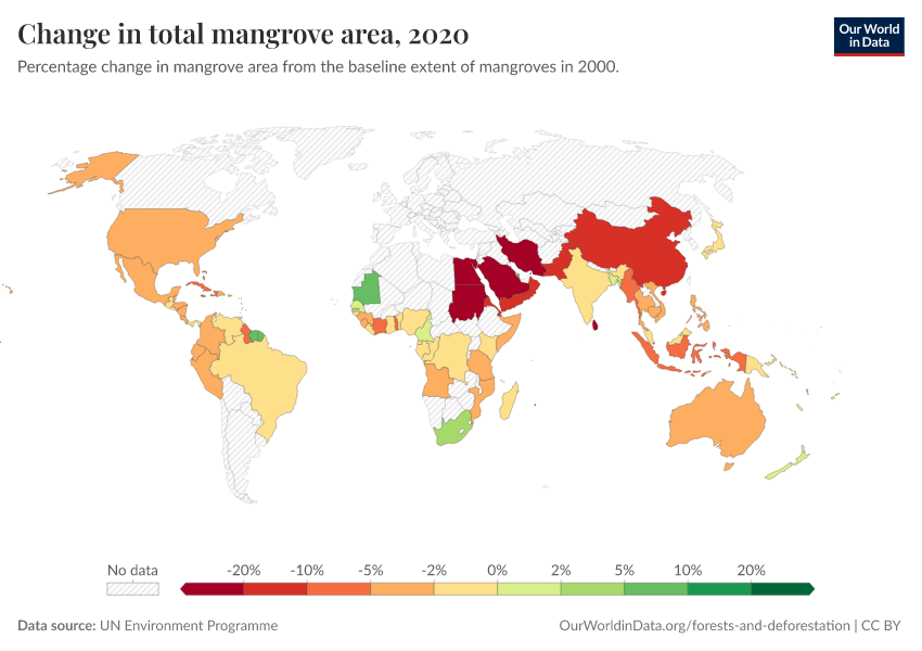 “Data Page: Change in total mangrove area”. Our World in Data (2026). Data adapted from UN Environment Programme. Retrieved from https://edit-mdim.owid.pages.dev:8789/20260130-180113/grapher/change-in-total-mangrove-area.html [online resource] (archived on January 30, 2026).How to cite this data