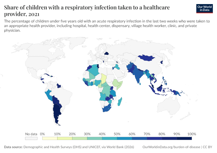 “Data Page: Share of children with a respiratory infection taken to a healthcare provider ”. Our World in Data (2026). Data adapted from Demographic and Health Surveys (DHS) and UNICEF, via World Bank. Retrieved from https://edit-mdim.owid.pages.dev:8789/20260202-181317/grapher/children-treated-ari.html [online resource] (archived on February 2, 2026).How to cite this data