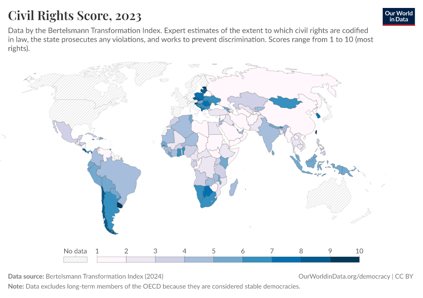 “Data Page: Civil Rights Score”, part of the following publication: Bastian Herre, Lucas Rodés-Guirao, and Esteban Ortiz-Ospina (2013) - “Democracy”. Data adapted from Bertelsmann Transformation Index. Retrieved from https://edit-mdim.owid.pages.dev:8789/20260204-165456/grapher/civil-rights-score-bti.html [online resource] (archived on February 4, 2026).How to cite this data