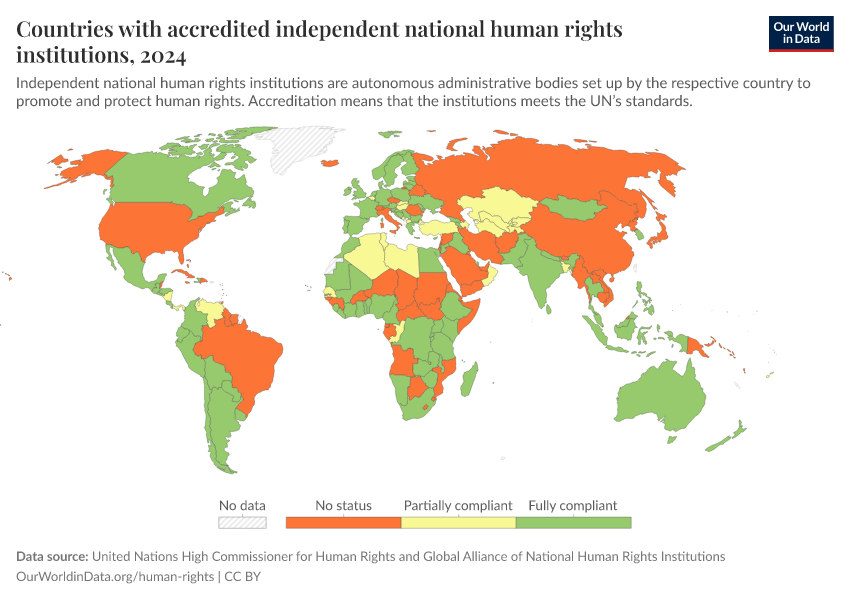 “Data Page: Countries with accredited independent national human rights institutions”. Our World in Data (2026). Data adapted from United Nations High Commissioner for Human Rights and Global Alliance of National Human Rights Institutions. Retrieved from https://edit-mdim.owid.pages.dev:8789/20251120-211038/grapher/countries-with-independent-national-human-rights-institution.html [online resource] (archived on November 20, 2025).How to cite this data