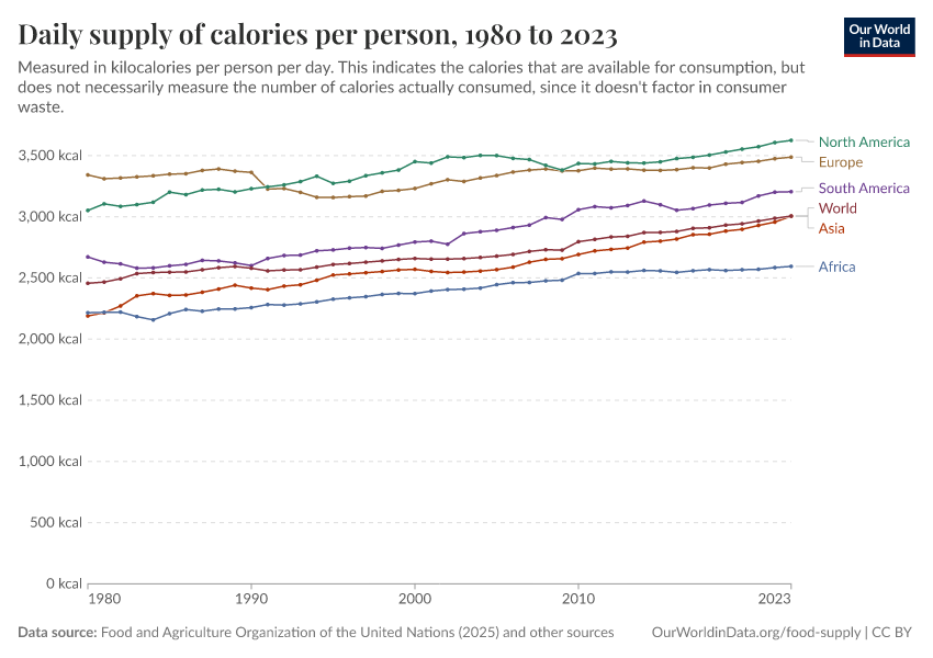 “Data Page: Daily supply of calories per person”, part of the following publication: Max Roser, Hannah Ritchie, and Pablo Rosado (2013) - “Food Supply”. Data adapted from Food and Agriculture Organization of the United Nations, Harris et al., Floud et al., Jonsson, Grigg, Fogel, USDA Economic Research Service (ERS). Retrieved from https://edit-mdim.owid.pages.dev:8789/20260116-144923/grapher/daily-per-capita-caloric-supply.html [online resource] (archived on January 16, 2026).How to cite this data