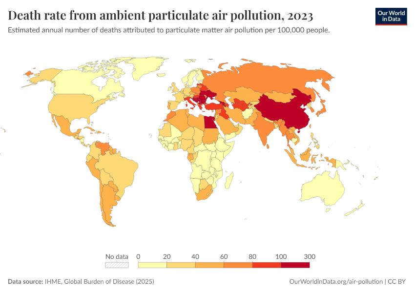 “Data Page: Death rate from ambient particulate air pollution”, part of the following publication: Esteban Ortiz-Ospina and Max Roser (2016) - “Global Health”. Data adapted from IHME, Global Burden of Disease. Retrieved from https://edit-mdim.owid.pages.dev:8789/20260213-112438/grapher/death-rate-from-ambient-particulate-air-pollution.html [online resource] (archived on February 13, 2026).How to cite this data