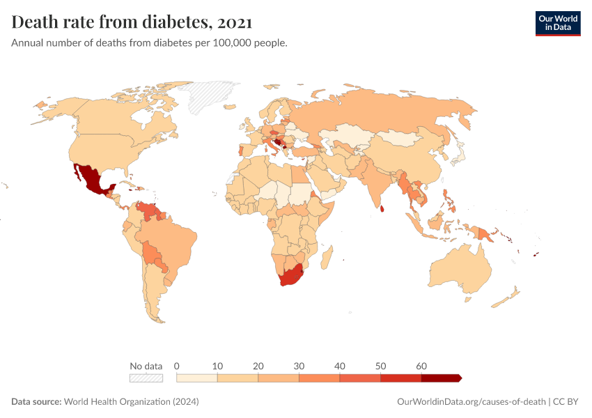 “Data Page: Death rate from diabetes”, part of the following publication: Esteban Ortiz-Ospina and Max Roser (2016) - “Global Health”. Data adapted from World Health Organization. Retrieved from https://edit-mdim.owid.pages.dev:8789/20250909-093708/grapher/death-rate-from-diabetes-ghe.html [online resource] (archived on September 9, 2025).How to cite this data