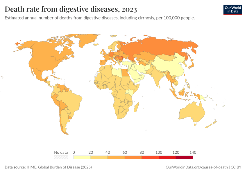 IHME, Global Burden of Disease (2025) – with major processing by Our World in Data. “Death rate from digestive diseases” [dataset]. IHME, Global Burden of Disease, “Global Burden of Disease - Deaths” [original data]. Retrieved February 24, 2026 from https://edit-mdim.owid.pages.dev:8789/20260211-174736/grapher/death-rate-from-digestive-diseases-gbd.html (archived on February 11, 2026).