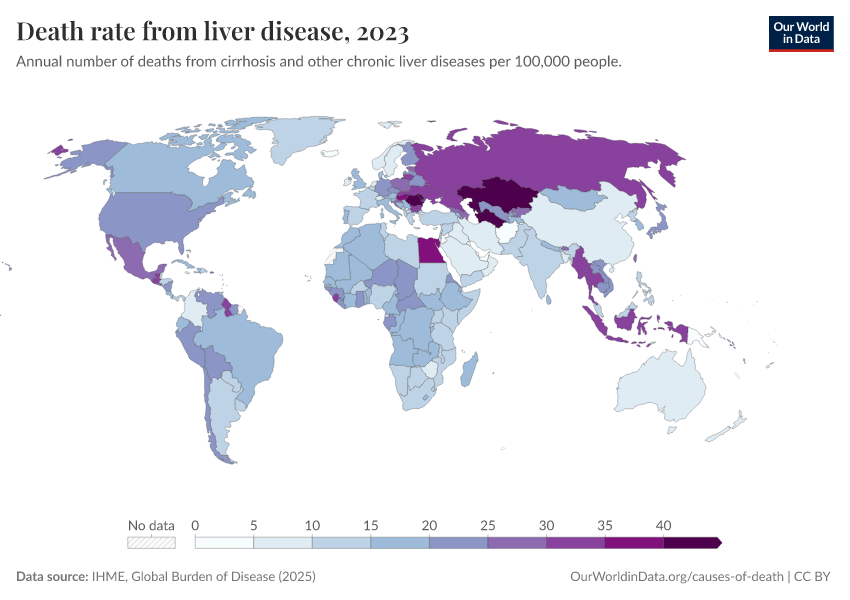 IHME, Global Burden of Disease (2025) – with major processing by Our World in Data. “Death rate from liver disease” [dataset]. IHME, Global Burden of Disease, “Global Burden of Disease - Deaths” [original data]. Retrieved February 24, 2026 from https://edit-mdim.owid.pages.dev:8789/20260211-174736/grapher/death-rate-from-liver-disease-gbd.html (archived on February 11, 2026).