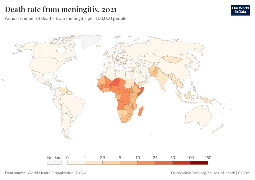 World Health Organization (2024) – with major processing by Our World in Data. “Death rate from meningitis” [dataset]. World Health Organization, “Global Health Estimates” [original data]. Retrieved February 24, 2026 from https://edit-mdim.owid.pages.dev:8789/20250909-093708/grapher/death-rate-from-meningitis-who.html (archived on September 9, 2025).