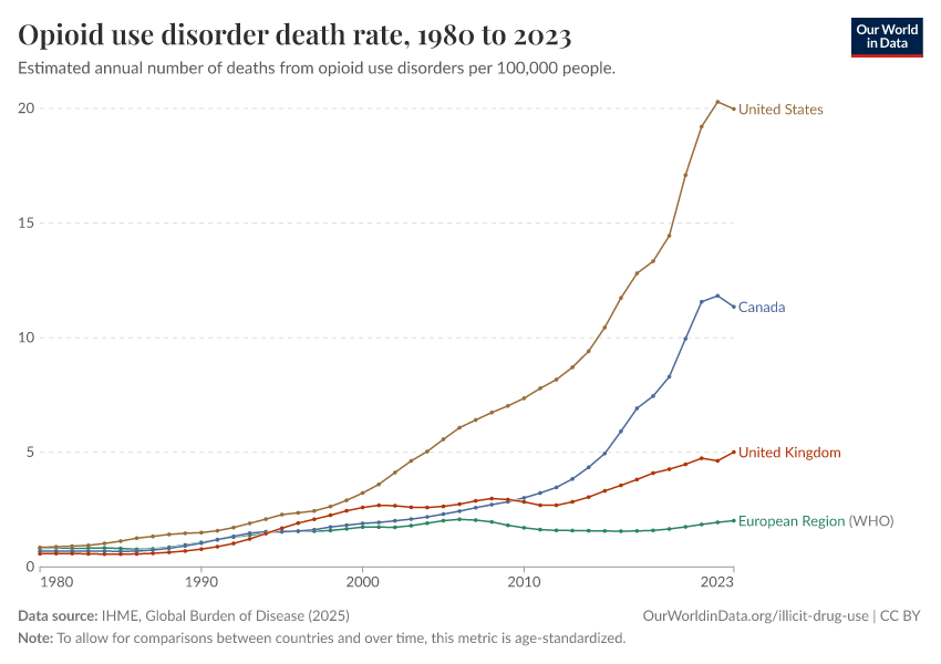 IHME, Global Burden of Disease (2025) – with major processing by Our World in Data. “Opioid use disorder death rate” [dataset]. IHME, Global Burden of Disease, “Global Burden of Disease - Deaths” [original data]. Retrieved February 24, 2026 from https://edit-mdim.owid.pages.dev:8789/20260211-174736/grapher/death-rate-from-opioid-use.html (archived on February 11, 2026).