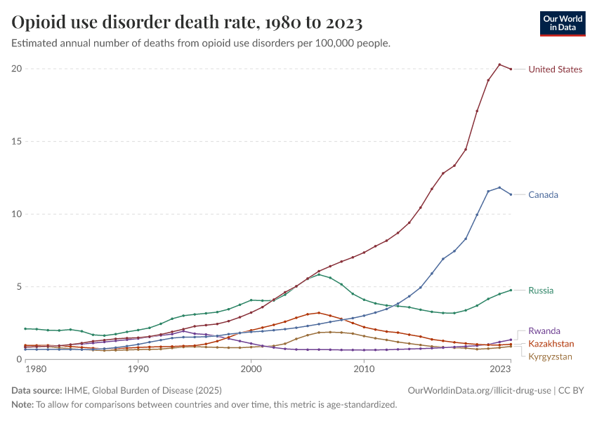 IHME, Global Burden of Disease (2025) – with major processing by Our World in Data. “Opioid use disorder death rate” [dataset]. IHME, Global Burden of Disease, “Global Burden of Disease - Deaths” [original data]. Retrieved February 24, 2026 from https://edit-mdim.owid.pages.dev:8789/20260211-174736/grapher/death-rate-from-opioid-use.html (archived on February 11, 2026).