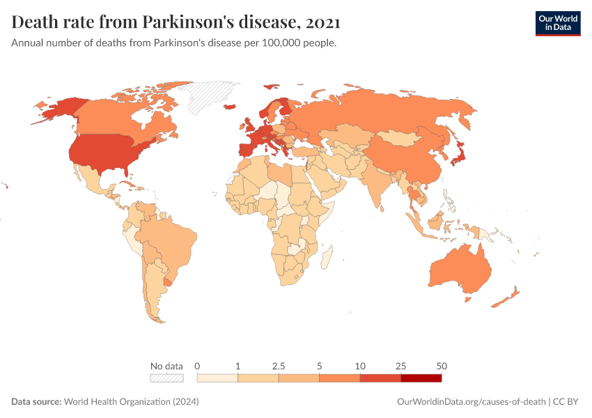 World Health Organization (2024) – with major processing by Our World in Data. “Death rate from Parkinson's disease” [dataset]. World Health Organization, “Global Health Estimates” [original data]. Retrieved February 24, 2026 from https://edit-mdim.owid.pages.dev:8789/20250909-093708/grapher/death-rate-from-parkinsons-disease-ghe.html (archived on September 9, 2025).