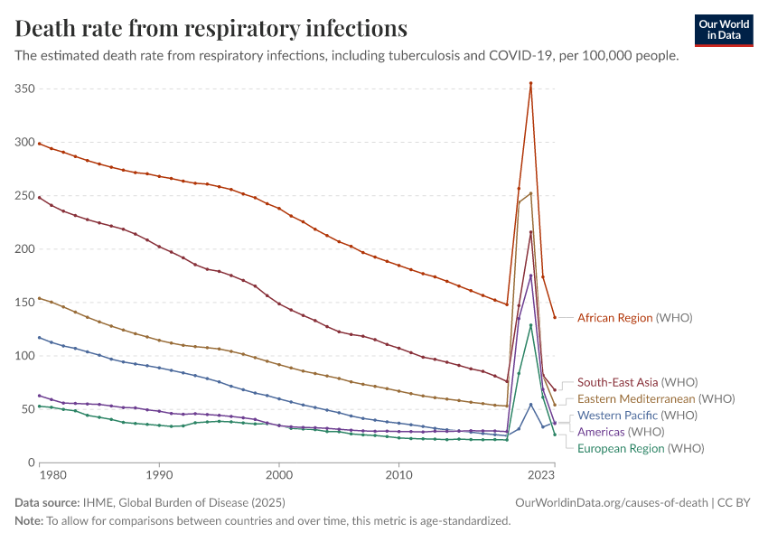 IHME, Global Burden of Disease (2025) – with major processing by Our World in Data. “Death rate from respiratory infections” [dataset]. IHME, Global Burden of Disease, “Global Burden of Disease - Deaths” [original data]. Retrieved February 24, 2026 from https://edit-mdim.owid.pages.dev:8789/20260211-174736/grapher/death-rate-from-respiratory-infections.html (archived on February 11, 2026).