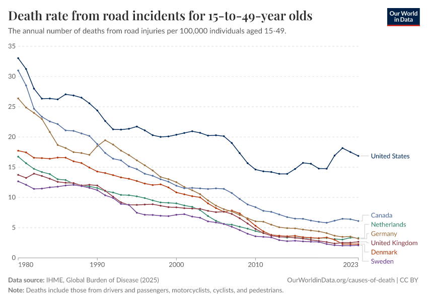 IHME, Global Burden of Disease (2025) – with major processing by Our World in Data. “Death rate from road incidents for 15-to-49-year olds” [dataset]. IHME, Global Burden of Disease, “Global Burden of Disease - Deaths” [original data]. Retrieved February 24, 2026 from https://edit-mdim.owid.pages.dev:8789/20260211-174736/grapher/death-rate-from-road-accidents-for-15--to-49-year-olds.html (archived on February 11, 2026).