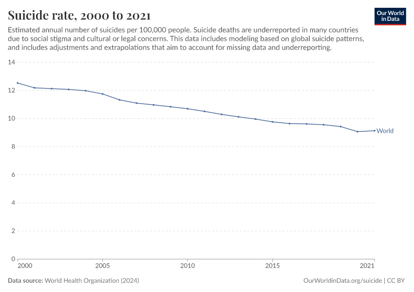 World Health Organization (2024) – with major processing by Our World in Data. “Suicide rate” [dataset]. World Health Organization, “Global Health Estimates” [original data]. Retrieved February 24, 2026 from https://edit-mdim.owid.pages.dev:8789/20250909-093708/grapher/death-rate-from-suicides-ghe.html (archived on September 9, 2025).