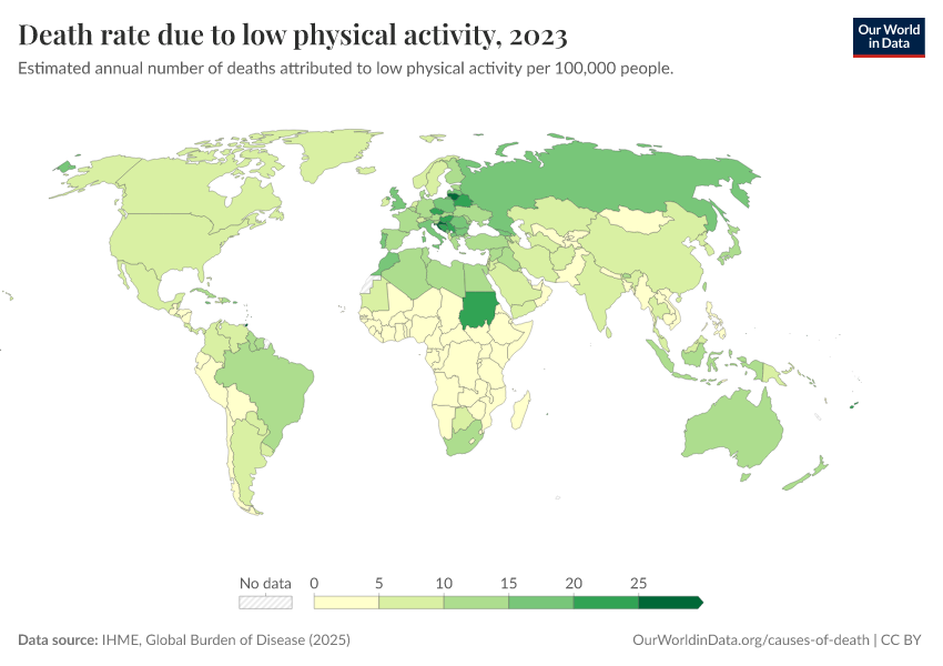 “Data Page: Death rate due to low physical activity”, part of the following publication: Esteban Ortiz-Ospina and Max Roser (2016) - “Global Health”. Data adapted from IHME, Global Burden of Disease. Retrieved from https://edit-mdim.owid.pages.dev:8789/20260213-112438/grapher/death-rates-due-to-low-physical-activity-gbd.html [online resource] (archived on February 13, 2026).How to cite this data