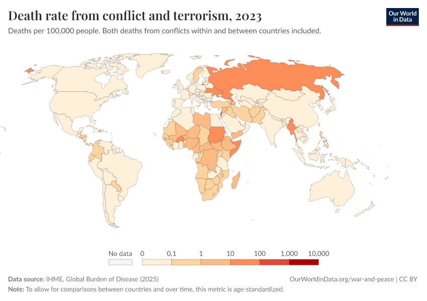 “Data Page: Death rate from conflict and terrorism”, part of the following publication: Esteban Ortiz-Ospina and Max Roser (2016) - “Global Health”. Data adapted from IHME, Global Burden of Disease. Retrieved from https://edit-mdim.owid.pages.dev:8789/20260211-174736/grapher/death-rates-from-conflict-and-terrorism-gbd.html [online resource] (archived on February 11, 2026).