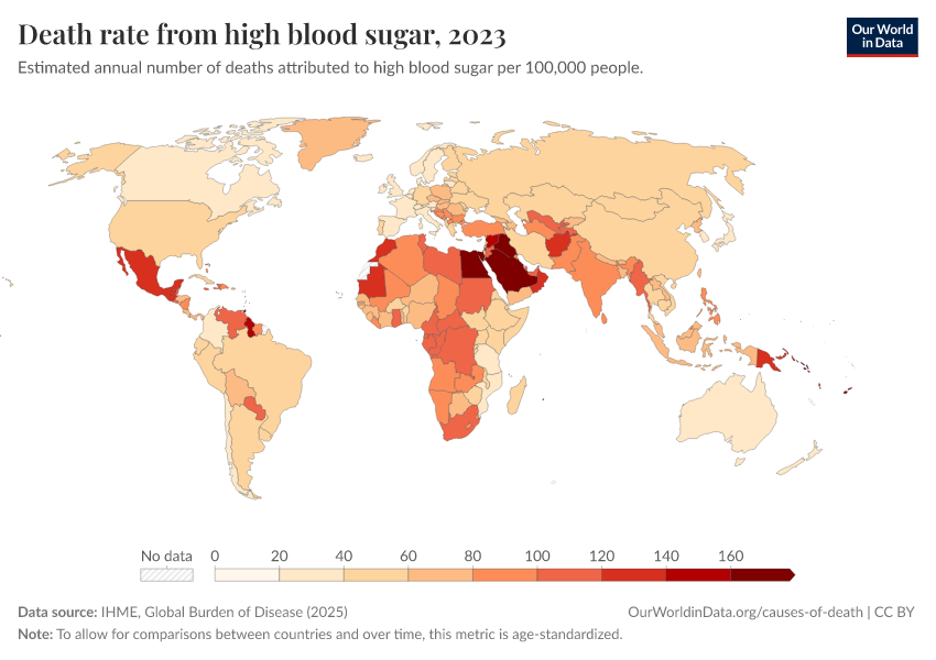 “Data Page: Death rate from high blood sugar”, part of the following publication: Esteban Ortiz-Ospina and Max Roser (2016) - “Global Health”. Data adapted from IHME, Global Burden of Disease. Retrieved from https://edit-mdim.owid.pages.dev:8789/20260213-112438/grapher/death-rates-from-high-blood-sugar.html [online resource] (archived on February 13, 2026).How to cite this data