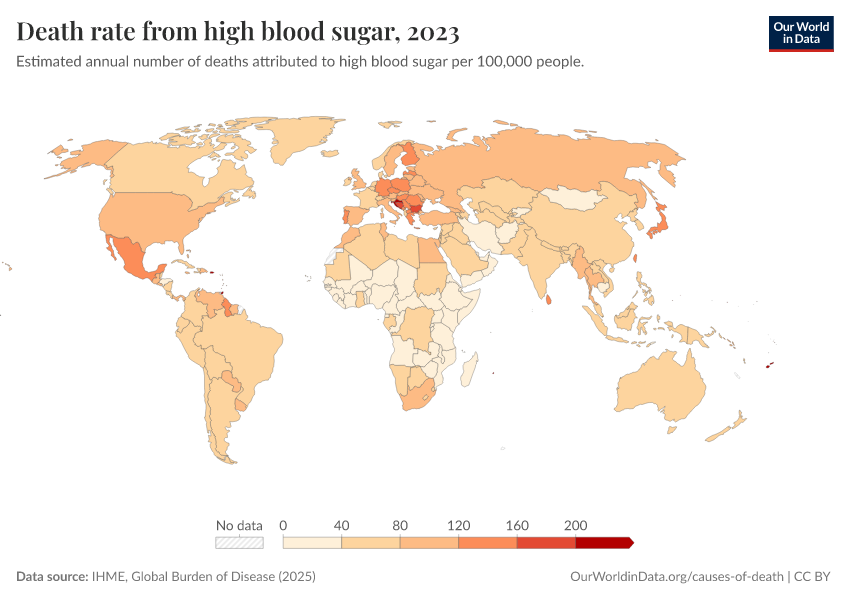 “Data Page: Death rate from high blood sugar”, part of the following publication: Esteban Ortiz-Ospina and Max Roser (2016) - “Global Health”. Data adapted from IHME, Global Burden of Disease. Retrieved from https://edit-mdim.owid.pages.dev:8789/20260213-112438/grapher/death-rates-from-high-blood-sugar-gbd.html [online resource] (archived on February 13, 2026).How to cite this data