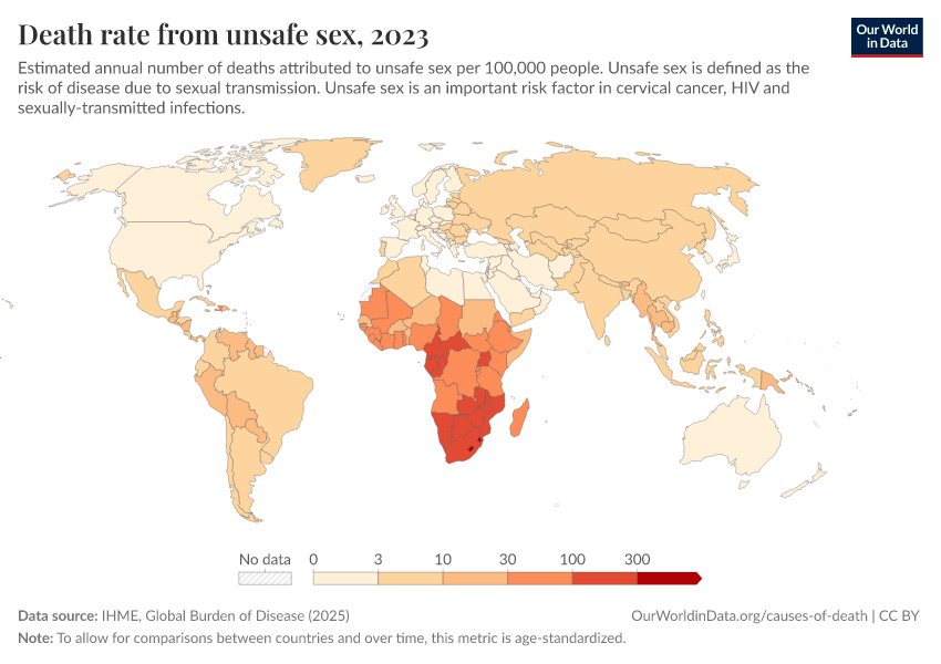 IHME, Global Burden of Disease (2025) – with major processing by Our World in Data. “Death rate from unsafe sex” [dataset]. IHME, Global Burden of Disease, “Global Burden of Disease - Risk Factors - Deaths” [original data]. Retrieved February 24, 2026 from https://edit-mdim.owid.pages.dev:8789/20260213-113303/grapher/death-rates-from-unsafe-sex.html (archived on February 13, 2026).