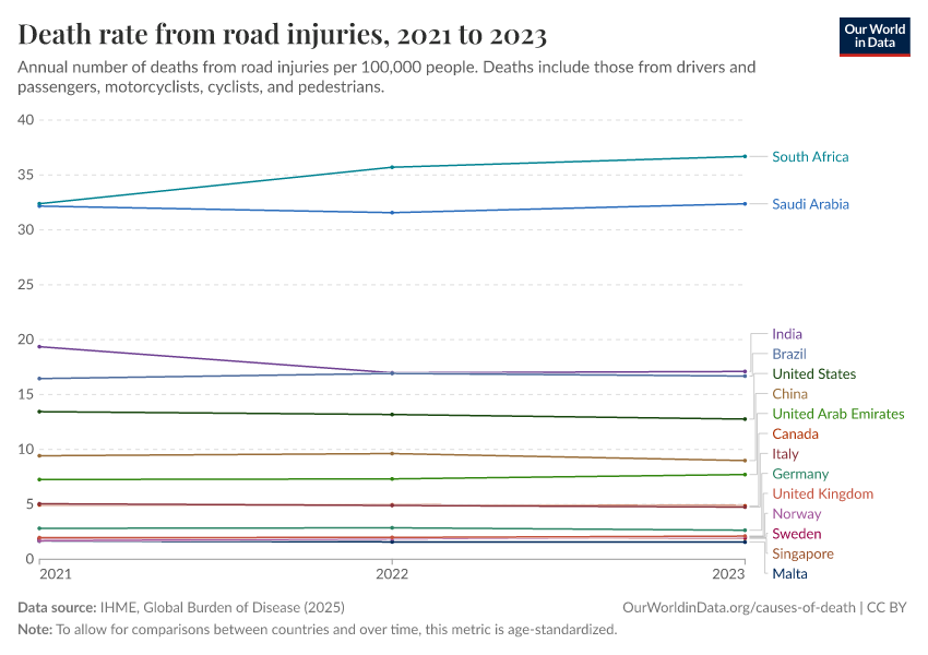 IHME, Global Burden of Disease (2025) – with major processing by Our World in Data. “Death rate from road injuries” [dataset]. IHME, Global Burden of Disease, “Global Burden of Disease - Deaths” [original data]. Retrieved February 24, 2026 from https://edit-mdim.owid.pages.dev:8789/20260211-173942/grapher/death-rates-road-incidents.html (archived on February 11, 2026).