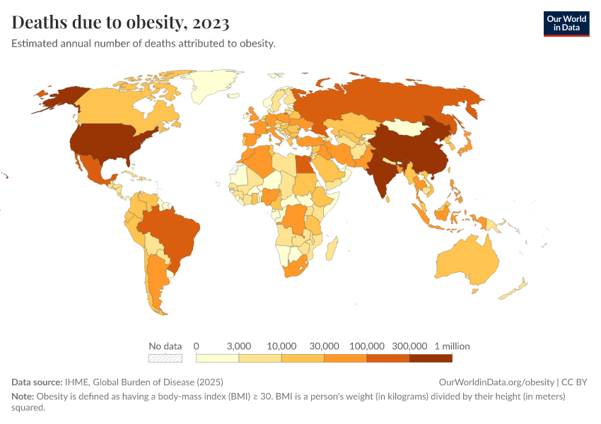 IHME, Global Burden of Disease (2025) – with major processing by Our World in Data. “Deaths due to obesity” [dataset]. IHME, Global Burden of Disease, “Global Burden of Disease - Risk Factors - Deaths” [original data]. Retrieved February 24, 2026 from https://edit-mdim.owid.pages.dev:8789/20260213-112438/grapher/deaths-due-to-obesity.html (archived on February 13, 2026).
