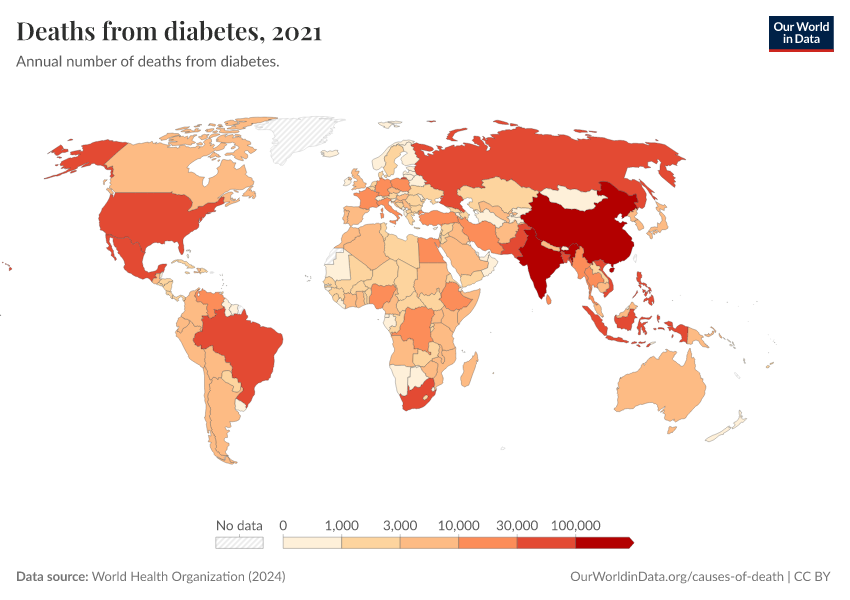 “Data Page: Deaths from diabetes”, part of the following publication: Esteban Ortiz-Ospina and Max Roser (2016) - “Global Health”. Data adapted from World Health Organization. Retrieved from https://edit-mdim.owid.pages.dev:8789/20250909-093708/grapher/deaths-from-diabetes-ghe.html [online resource] (archived on September 9, 2025).How to cite this data