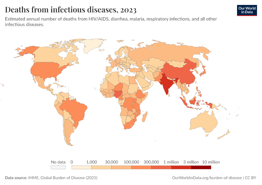 “Data Page: Deaths from infectious diseases”, part of the following publication: Esteban Ortiz-Ospina and Max Roser (2016) - “Global Health”. Data adapted from IHME, Global Burden of Disease. Retrieved from https://edit-mdim.owid.pages.dev:8789/20260211-174736/grapher/deaths-from-infectious-diseases.html [online resource] (archived on February 11, 2026).How to cite this data