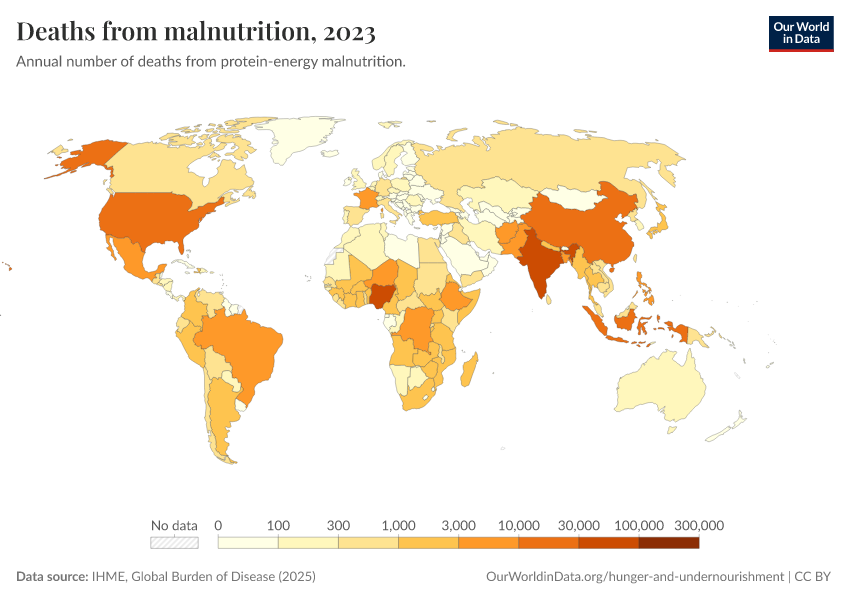 IHME, Global Burden of Disease (2025) – with major processing by Our World in Data. “Deaths from malnutrition” [dataset]. IHME, Global Burden of Disease, “Global Burden of Disease - Deaths” [original data]. Retrieved February 24, 2026 from https://edit-mdim.owid.pages.dev:8789/20260211-174736/grapher/deaths-from-malnutrition.html (archived on February 11, 2026).