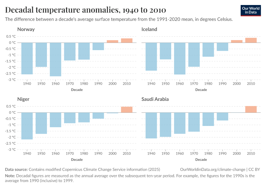 Contains modified Copernicus Climate Change Service information (2025) – with major processing by Our World in Data. “Decadal temperature anomalies” [dataset]. Contains modified Copernicus Climate Change Service information, “ERA5 monthly averaged data on single levels from 1940 to present 2” [original data]. Retrieved February 24, 2026 from https://edit-mdim.owid.pages.dev:8789/20260210-110915/grapher/decadal-temperature-anomaly.html (archived on February 10, 2026).