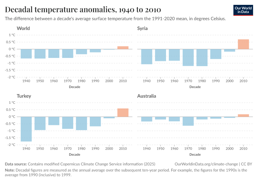 Contains modified Copernicus Climate Change Service information (2025) – with major processing by Our World in Data. “Decadal temperature anomalies” [dataset]. Contains modified Copernicus Climate Change Service information, “ERA5 monthly averaged data on single levels from 1940 to present 2” [original data]. Retrieved February 24, 2026 from https://edit-mdim.owid.pages.dev:8789/20260210-110915/grapher/decadal-temperature-anomaly.html (archived on February 10, 2026).