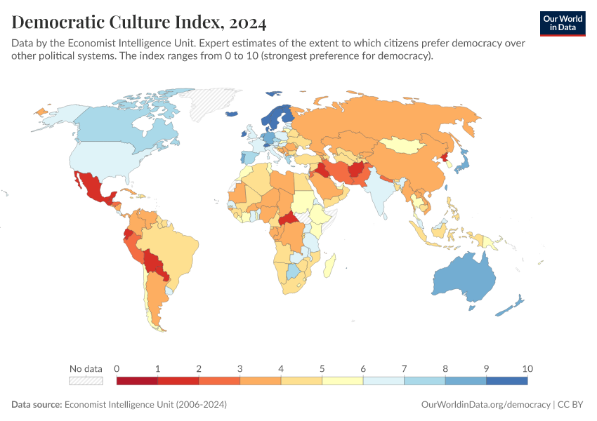 Economist Intelligence Unit (2006-2024) – processed by Our World in Data. “Democratic Culture Index” [dataset]. Economist Intelligence Unit, “Democracy Index 2021: The China challenge”; Economist Intelligence Unit, “Democracy Index 2022: Frontline democracy and the battle for Ukraine”; Economist Intelligence Unit, “Democracy Index 2023: Age of Conflict”; Economist Intelligence Unit, “Democracy Index 2024: What's wrong with representative democracy?”; Gapminder, “Democracy Index v4”; Various sources, “Population” [original data]. Retrieved February 24, 2026 from https://edit-mdim.owid.pages.dev:8789/20260119-070102/grapher/democratic-culture-index-eiu.html (archived on January 19, 2026).