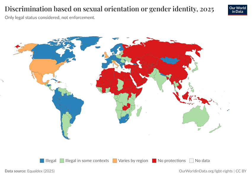 Equaldex (2025) – with major processing by Our World in Data. “Discrimination based on sexual orientation or gender identity” [dataset]. Equaldex, “Equaldex” [original data]. Retrieved February 24, 2026 from https://edit-mdim.owid.pages.dev:8789/20250909-093708/grapher/discrimination-lgbt-equaldex.html (archived on September 9, 2025).
