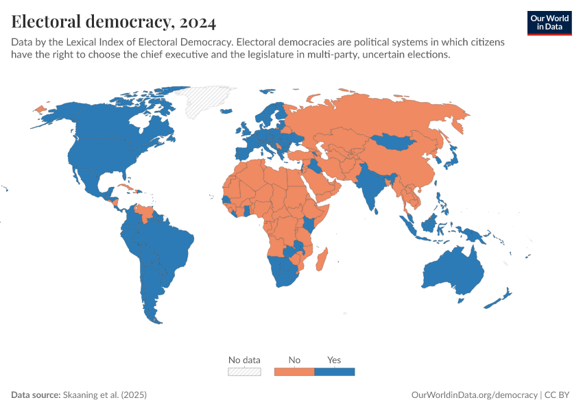 Skaaning et al. (2025) – processed by Our World in Data. “Electoral democracy” [dataset]. Skaaning et al., “Lexical Index of Electoral Democracy (LIED) v6.8” [original data]. Retrieved February 24, 2026 from https://edit-mdim.owid.pages.dev:8789/20260119-065148/grapher/electoral-democracy-lexical.html (archived on January 19, 2026).