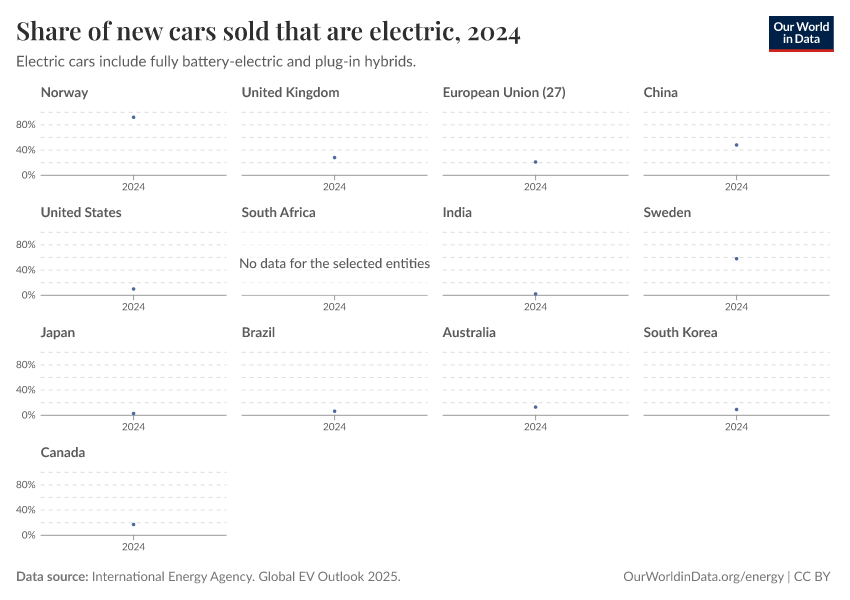 “Data Page: Share of new cars sold that are electric”. Our World in Data (2026). Data adapted from International Energy Agency. Global EV Outlook 2025.. Retrieved from https://edit-mdim.owid.pages.dev:8789/20250909-093708/grapher/electric-car-sales-share.html [online resource] (archived on September 9, 2025).How to cite this data