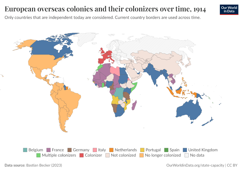 “Data Page: European overseas colonies and their colonizers over time”, part of the following publication: Bastian Herre and Pablo Arriagada (2023) - “State Capacity”. Data adapted from Bastian Becker. Retrieved from https://edit-mdim.owid.pages.dev:8789/20250909-093708/grapher/european-overseas-colonies-and-their-colonizers.html [online resource] (archived on September 9, 2025).How to cite this data