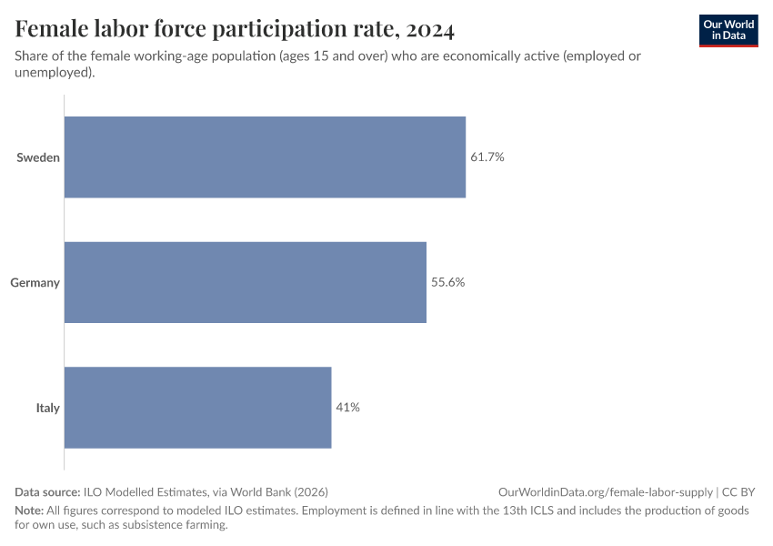 “Data Page: Female labor force participation rate”. Our World in Data (2026). Data adapted from ILO Modelled Estimates, via World Bank. Retrieved from https://edit-mdim.owid.pages.dev:8789/20260223-234835/grapher/female-labor-force-participation-rates.html [online resource] (archived on February 23, 2026).How to cite this data