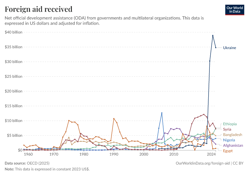 OECD (2025) – with major processing by Our World in Data. “Foreign aid received – Official donors” [dataset]. OECD, “OECD Official Development Assistance (ODA) - DAC2A: Aid (ODA) disbursements to countries and regions” [original data]. Retrieved February 24, 2026 from https://edit-mdim.owid.pages.dev:8789/20260223-070107/grapher/foreign-aid-received-net.html (archived on February 23, 2026).
